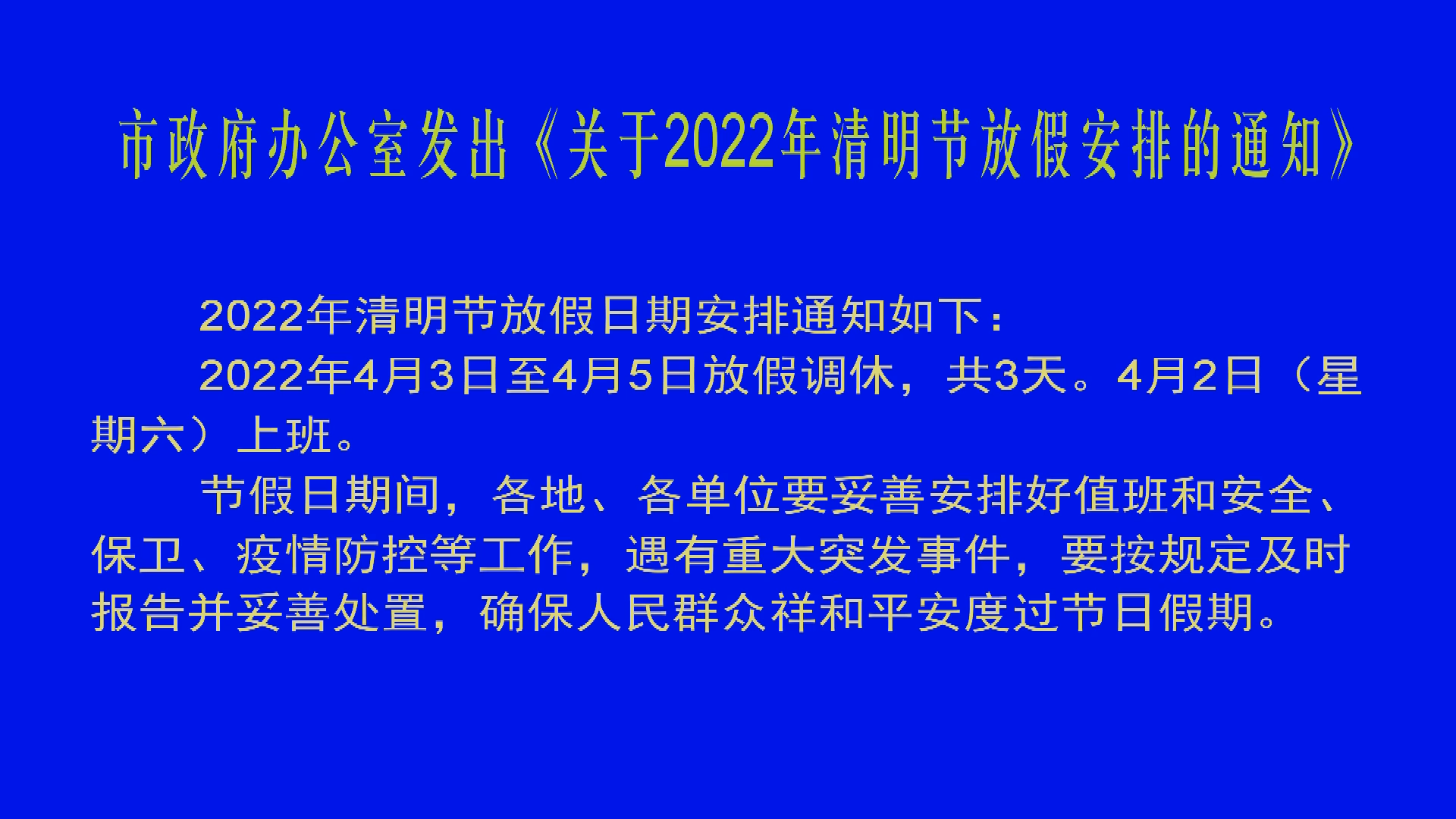 市政府辦公室發(fā)出《關(guān)于2022年清明節(jié)放假安排的通知》